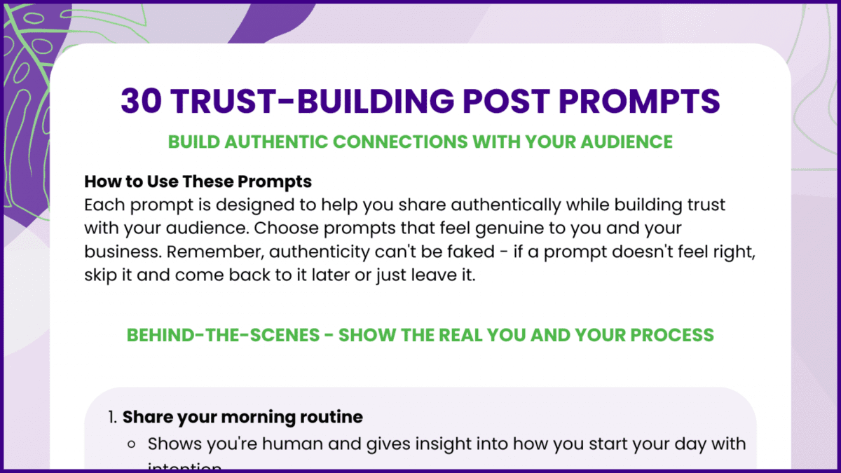 The prompts I’ve put together aren’t just random content ideas. Each one is designed to help you share authentically while building specific aspects of trust with your audience.